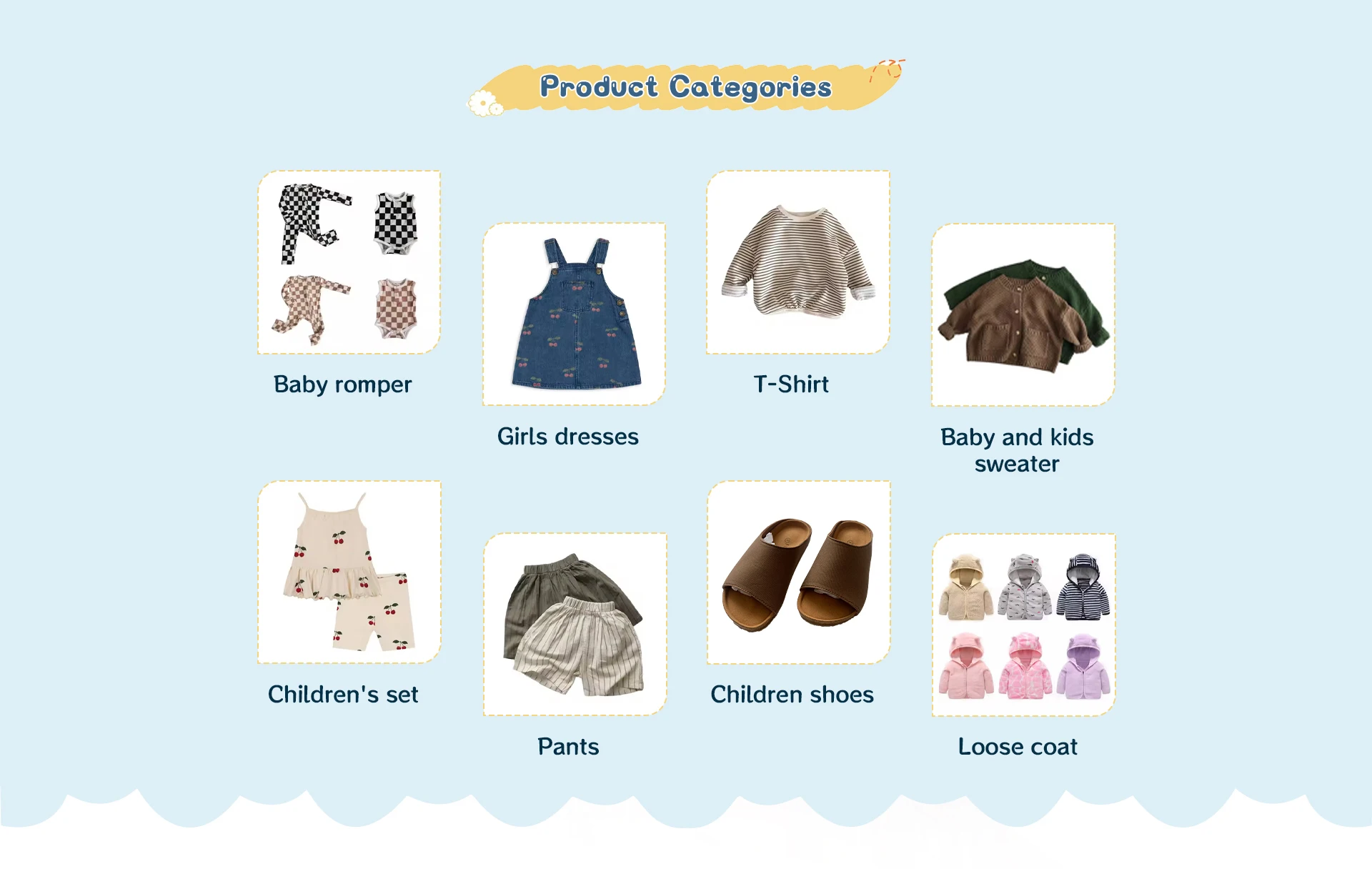 Productos principales:Ropa para niños, camiseta para niños, pantalones para niños, vestido para niñas, conjunto para niños